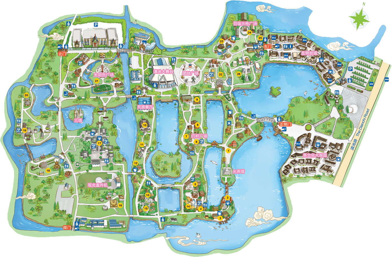 彝族在云南境內(nèi)約471萬人,是省內(nèi)人口最多、分布最廣的少數(shù)民族,主要聚居在金沙江、元江流域和哀牢山、無量山腹地。彝族是一個能歌善舞的民族,民間打歌、跳樂之風盛行,大三弦、跌腳舞久負盛名。火把節(jié)是彝族最具特色的民族節(jié)日。彝族村占地50余畝,三虎浮雕墻與虎頭內(nèi)祖師形象表現(xiàn)了彝族虎鷹文化。太陽歷廣場圖騰柱上有太陽、虎、火和八卦圖形象,周圍環(huán)繞著10個朝向不同的月球造型,外圓周有12生肖石雕。依山而建的“...